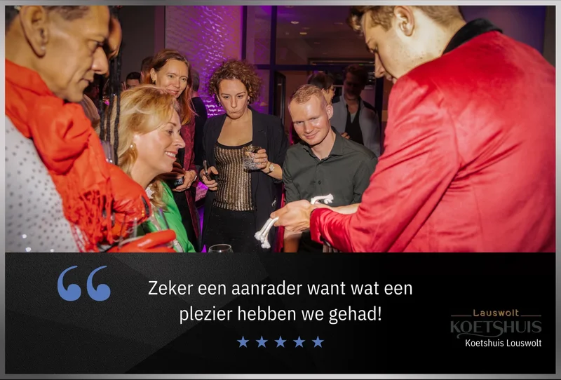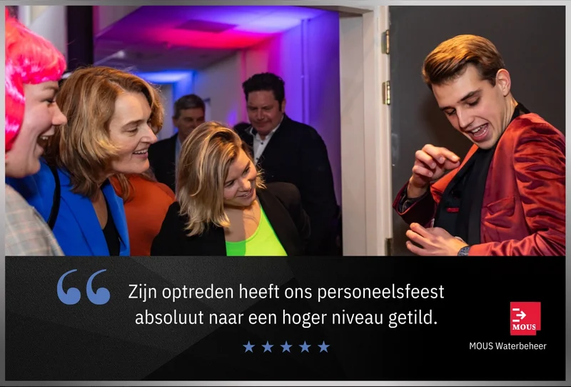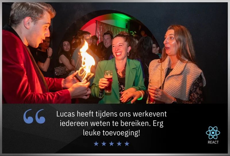 Tijdens het tafelgoochelen beweegt Lucas zich door de ruimte heen en vermaakt hij uw gasten waar zij met hun neus boven op zitten. Hij laat verschillende korte truc’s zien aan de tafels. Gezellige interactie staat hierbij op voorop! Het publiek zal met een lach, verbaasd & onvergetelijk gevoel achter gelaten worden. Met zijn vlotte babbel creeërt Lucas een gezellige en bindende sfeer bij uw gasten. Hiermee krijgt uw event een unieke twist! Een beleving waar uw gasten de rest van de middag of avond over zullen praten!